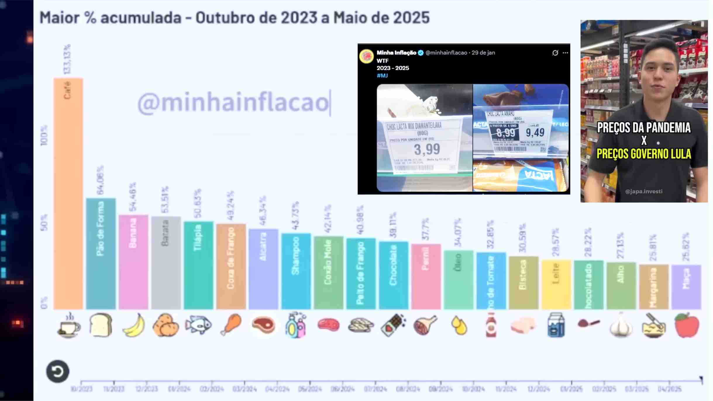 Usuários no Brasil compartilharam trechos do vídeo com a legenda “a inflação real”, sugerindo que os dados oficiais não estariam refletindo a experiência concreta do consumidor brasileiro diante do aumento de preços.