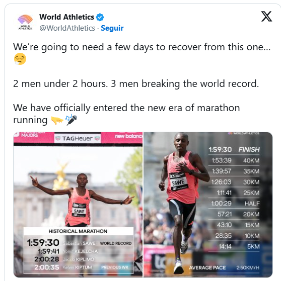 Na prova deste domingo, Sebastian Sawe não foi o único a completar os 43 quilômetros em menos de duas horas. O etíope Yomif Kejelcha conquistou a medalha de prata com o tempo de 1h59min41s. Já o bronze ficou com Jacob Kiplimo, de Uganda, que fez o tempo de 2h0028s.